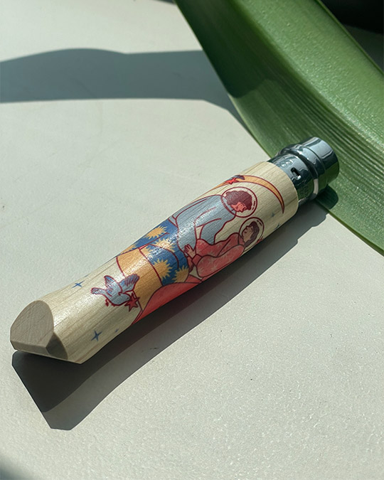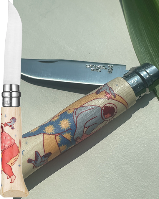 Die Galerie Art By Friends hat mir dieses Projekt vorgeschlagen und ich habe sofort zugesagt! Ich wohne im Haute-Savoie, Opinel ist hier quasi eine Institution. Hier besitzt jeder ein oder mehrere Opinels. Mir gefällt auch die Idee sehr gut, mit einer lokalen, umweltfreundlichen Marke und mit in Frankreich hergestellten Produkten zu arbeiten.