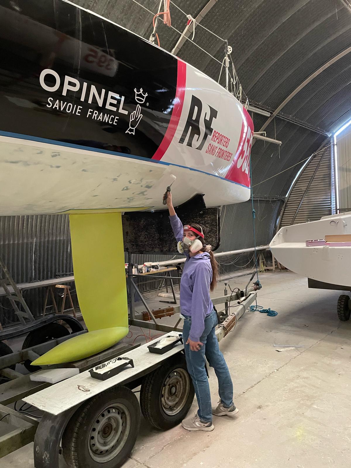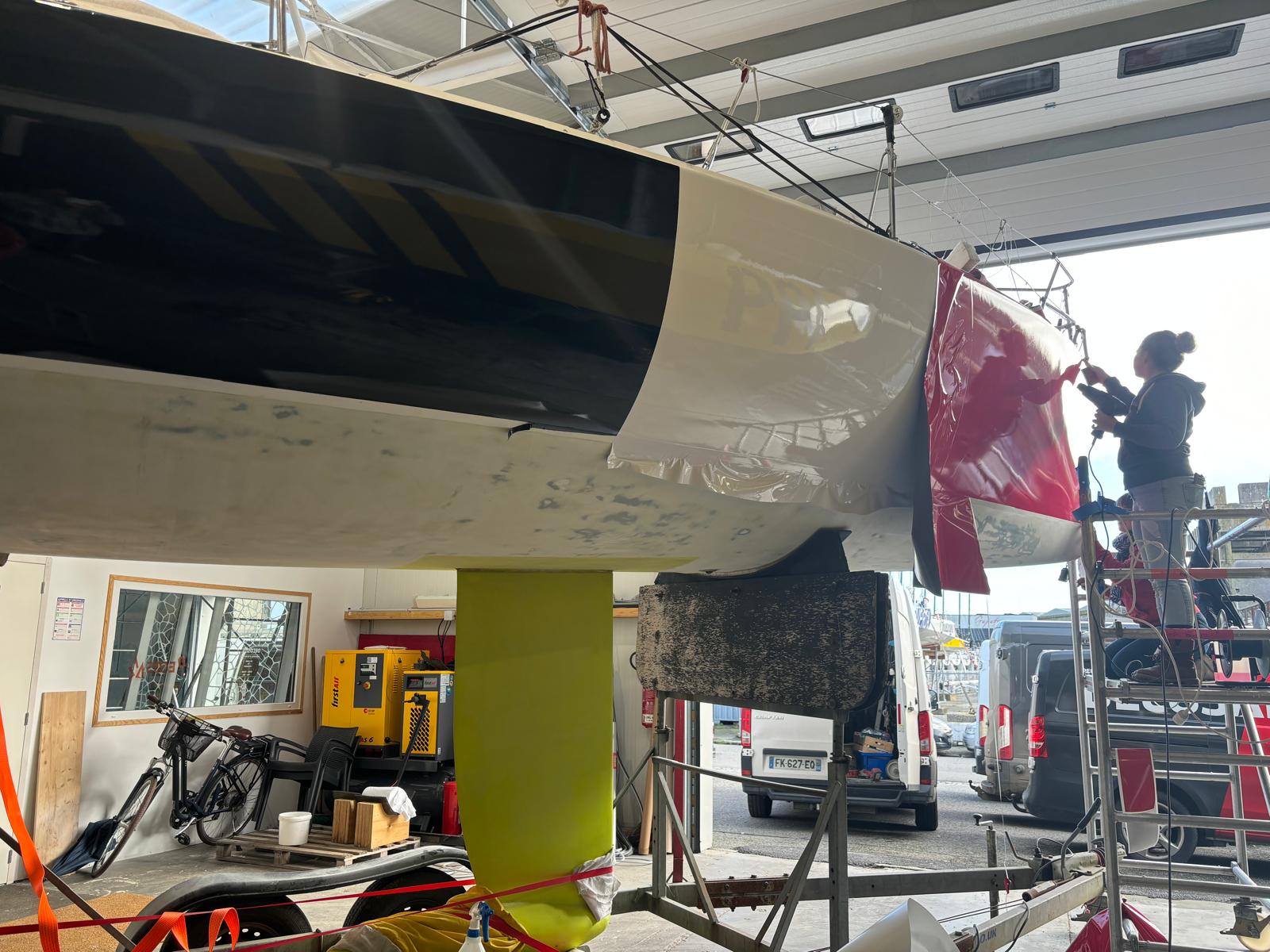 Enfin, la décoration. Retirer les anciens stickers de la coque – certains collés depuis plus de quinze ans et brûlés par les UV – fut un vrai défi. Beaucoup d’huile de coude ont été nécessaires avant d’emmener Kaïros chez Decosail, une entreprise lorientaise spécialiste de la déco des bateaux de course.
