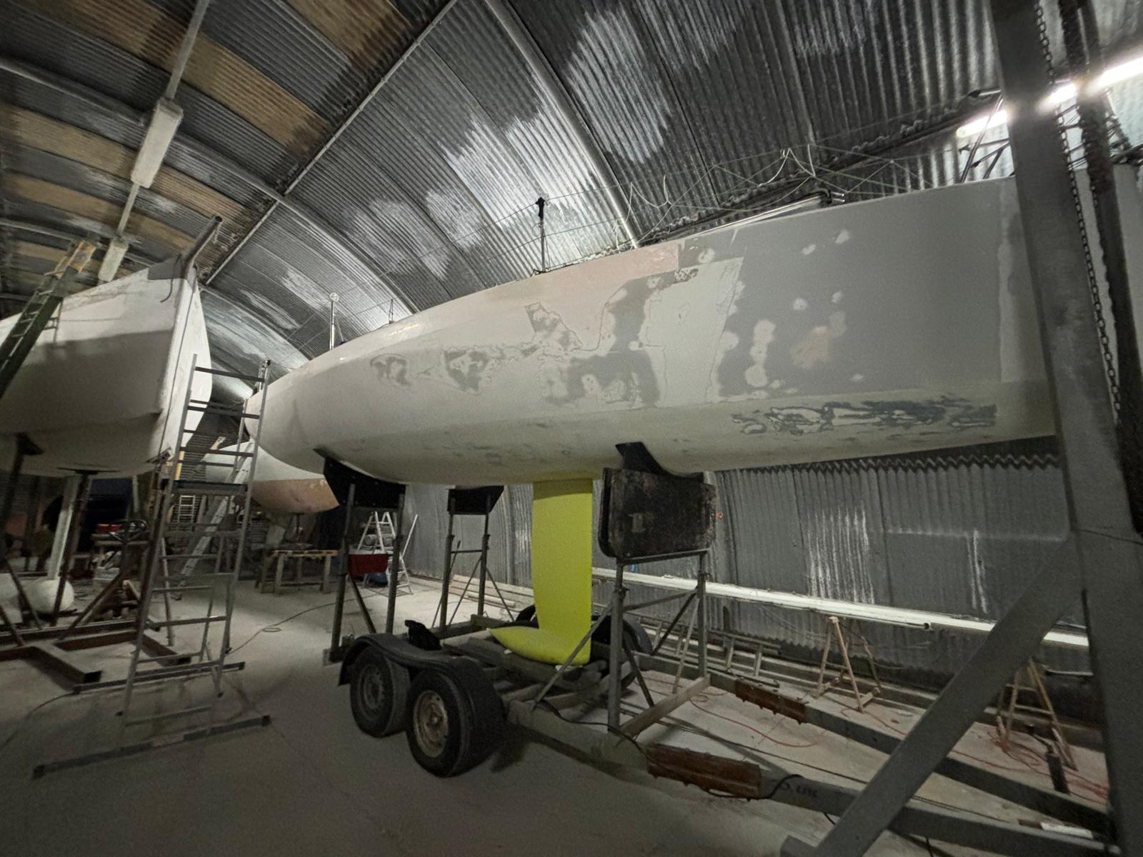 Top départ en novembre 2024. Le bateau est démâté et stocké durant l'hiver dans un hangar. J’ai pris soin de tout démonter pour le mettre à nu et repartir de zéro. Première étape : la sécurité, avec le remplacement des câbles du mât pour éviter toute mauvaise surprise en course.